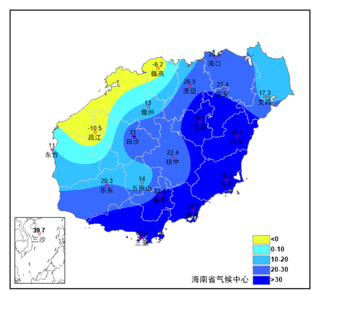 5月海南省平均降雨量365.4毫米,较常年同期偏多89.3%,为1951年以来第二多值,各地降雨量134.0(东方)~722.8毫米(三沙),屯昌(568.4毫米)和三沙(722.8毫米)均突破当地历史同期最多值。其中,5月30日三沙珊瑚岛(629.3毫米)和永兴岛(371.0毫米)降雨量均突破海南省国家气象观测站历史5月日最大降雨量极值。