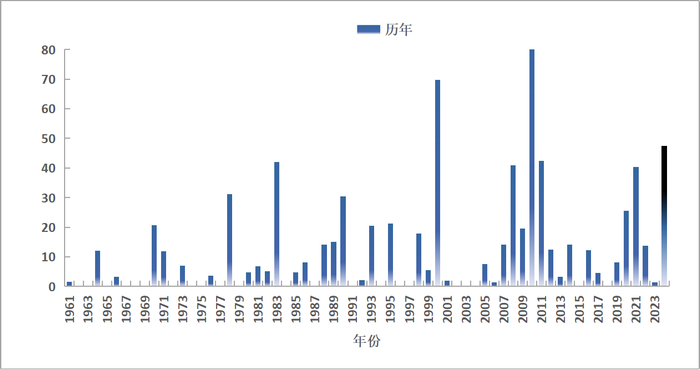1961~2024年10月海南省最强区域暴雨过程综合强度指数变化图