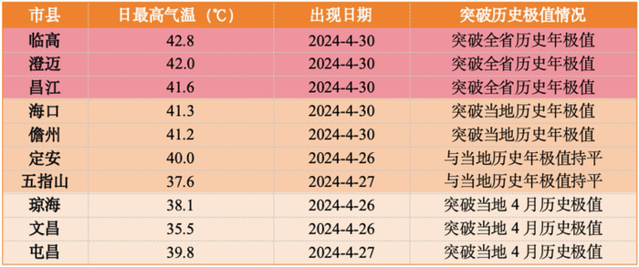 2024年4月海南省平均气温28.9℃,较常年同期偏高2.9℃,突破历史同期最高纪录。期间4月中下旬的高温天气过程极端性强,临高、澄迈和昌江日最高气温打破海南省国家气象观测站历史年极值,海口等7个市县日最高气温打破或达到当地历史年极值或4月历史极值。