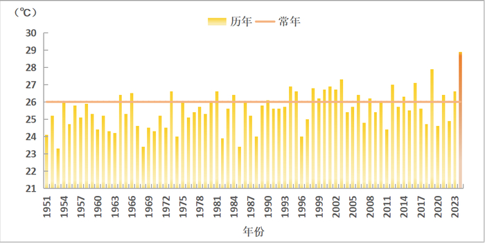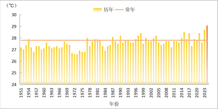 1951~2024年8月海南省平均气温变化图(单位:℃)