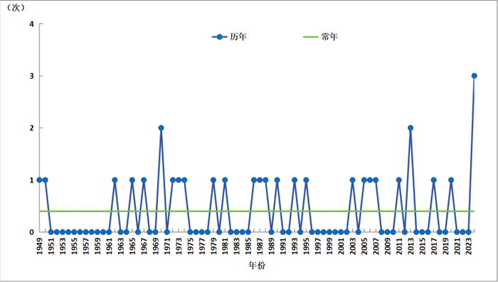 1949~2024年11月影响海南岛的热带气旋个数变化图(单位:个)