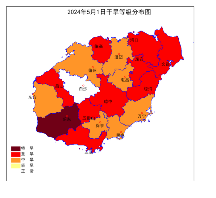 2024年海南省年平均气温25.7℃,较常年同期偏高0.9℃,为1951年以来第二暖年。其中文昌和五指山2个市县年平均气温突破当地历史最高纪录,定安、屯昌和三沙3个市县年平均气温与历史最高纪录持平。2024年1月2日~23日、1月28日~5月22日、8月10日~9月6日海南岛部分市县出现三次气象干旱过程,期间5月1日最为严重,有1个市县发展为特旱、9个市县重旱、7个市县中旱。