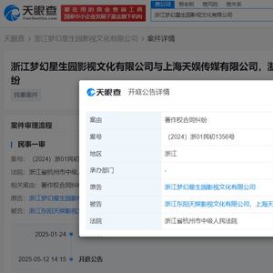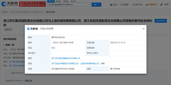 天眼查法律诉讼信息显示,近日,浙江省杭州市中级人民法院向郑爽公告送达浙江梦幻星生园影视文化有限公司诉其与浙江东阳天娱影视文化有限公司、上海天娱传媒有限公司著作权合同纠纷一案起诉状副本及开庭传票等,自公告之日起经过60日即视为送达。并定于2025年5月12日开庭审理。