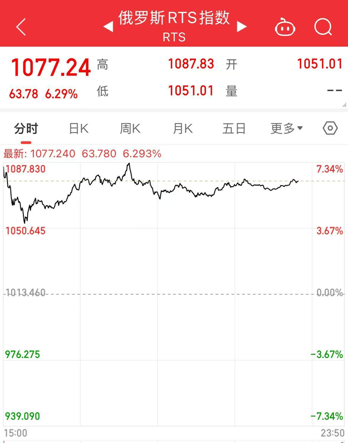 当地时间2月13日,俄罗斯股市大涨,截至发稿,俄罗斯RTS指数涨超6%。