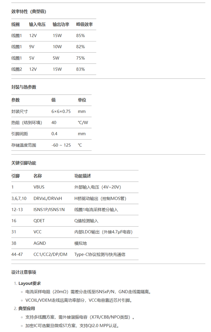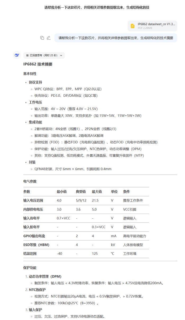 通过搭载先进的视觉语言模型,DeepSeek可瞬间解析整本规格书的结构,自动识别文档中的参数表格、波形图示和脚注说明,并将散落在不同页面的关联信息动态串联。例如当工程师上传某款无线充电芯片的规格书时,系统不仅会提取协议支持、工作电压、电气参数等基础参数,还能自动关联芯片内部框图、效率曲线以及应用原理图等,生成结构化的技术摘要。这种跨页面的语义理解能力,使得原本需要数小时查阅的工作缩短至几分钟。
