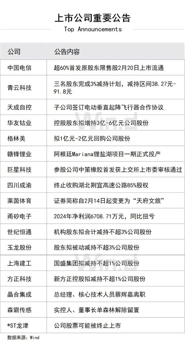 4、【债券重大事件】①龙光集团境外债务重组已获必要同意②泰兴市城市投资发展集团重要子公司被列为失信被执行人③侯顺利不再担任中国供销集团董事长④“H21汽车1”2月14日起停牌⑤“20邮储银行永续债”、“23义乌国资MTN001”、“22余姚城投MTN001”、“23南京新港MTN002”、“22上航Y1”将全额赎回。