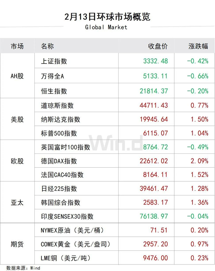 1、A股三大指数小幅下跌,TMT行业全线回调,半导体方向领跌;券商、DeepSeek题材冲高回落;大消费走强,影视、白酒、猪肉逆势上涨。截至收盘,上证指数跌0.42%报3332.48点,深证成指跌0.77%,创业板指跌0.71%,北证50跌1.76%,科创50跌2.31%,万得全A跌0.66%,万得A500跌0.23%,中证A500跌0.48%,市场成交1.85万亿元。