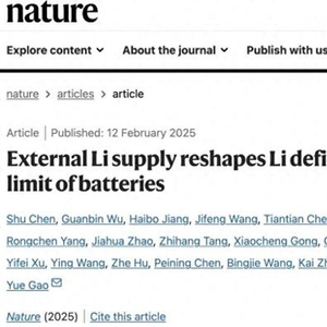 2月13日,复旦大学高分子科学系彭慧胜院士与高悦研究员团队在顶级学术期刊《自然》(Nature)发表颠覆性成果,提出“外部锂供应”技术:通过向电池注入新型有机锂盐,实现锂离子的精准补充,使商用锂电池循环寿命突破11818次(容量保持率96%),将锂电池寿命提升1-2个数量级。