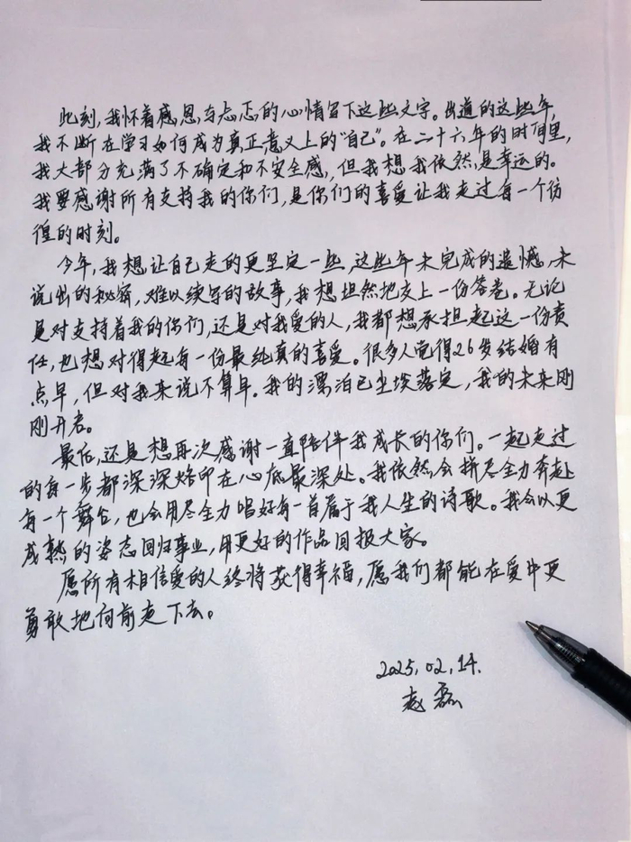 随后,赵磊晒出一封手写信,称“很多人觉得26岁结婚有点早,但对我来说不算早,我的漂泊已尘埃落定,未来刚刚开启”。赵磊还表示,未来依旧会全力以赴每一个舞台,全力唱好每一首歌,用更好的作品回报大家。