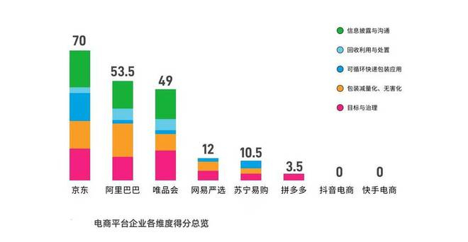 陈艾佳介绍:“电商平台在绿色化行动和信息披露上差异比较显著。”这从8家被《报告》评价的电商平台成绩分布可以看出来:第一梯队的京东以70分的成绩问鼎,第二梯队的成绩迅速降低到12分以下,第三梯队中的抖音和快手更是直接得了零分。