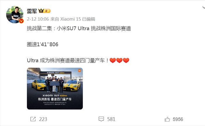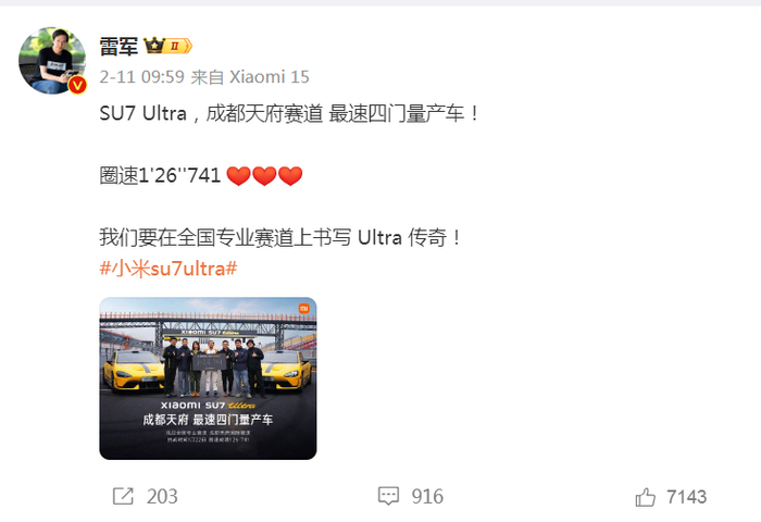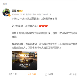 2月10日,小米创办人、董事长兼CEO雷军发文称,小米SU7 Ultra开启全国专业赛道的挑战,成绩明日起陆续公布。