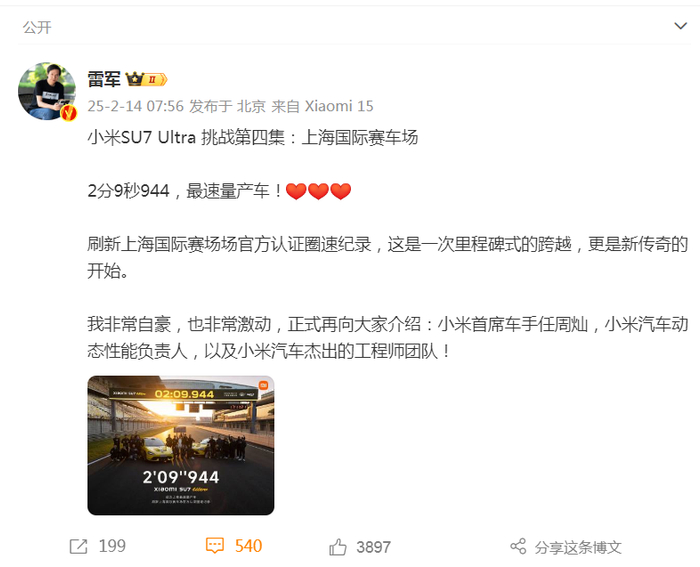 雷军称:“我们的工程师和车手做了很久的准备,请大家多多鼓励我们的团队!”