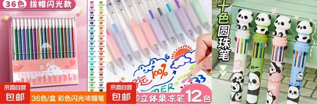除此之外,京喜自营还新增了36色闪光网红啫喱笔、12色3D立体果冻笔、熊猫物语十色圆珠笔等网红爆款。
