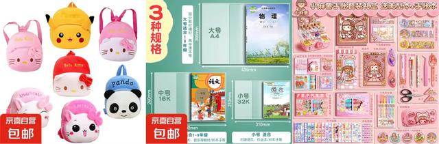 随着开学季的到来,为满足小朋友们对新书包的需求,京喜自营还推出了一系列卡通形象小书包,其中有充满趣味性的盲盒随机款毛绒双肩包,还有萌趣可爱的蓝熊猫款书包。考虑到开学包书的实际需求,京喜自营准备了多种尺寸的包书皮,大、中、小号可以随意组合,不管是哪个年级的学生,也无论是什么类型的书籍,都能找到合适的搭配。除此之外,京喜自营还上架了图案精美的手账套装、宿舍好物,同学们可以按需选购。