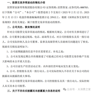 2月13日,居然智家新零售集团股份有限公司(以下简称“居然智家””)发布公告公司股票于2月12-13日连续2个交易日收盘价格涨幅偏离值累计达20%以上。经公司自查,不存在违反信息公平披露的情形。