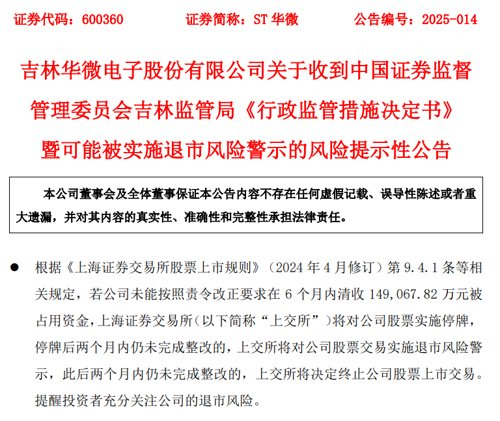 ST华微因14.91亿元资金占用等违法行为,或被停牌并实施退市警示