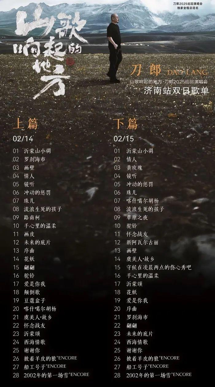 山水盈怀,春风送暖,一城山水皆成韵,山歌袅袅唤新春。山歌响起,百泉齐鸣,2月14日中午,刀郎的经纪公司啊呀啦嗦官方账号发布济南站演唱会歌单。