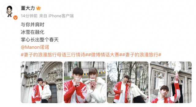 13点14分,前击剑运动员董力和@Manon诺诺 晒合照官宣参加节目《妻子的浪漫旅行》,间接官宣结婚喜讯。