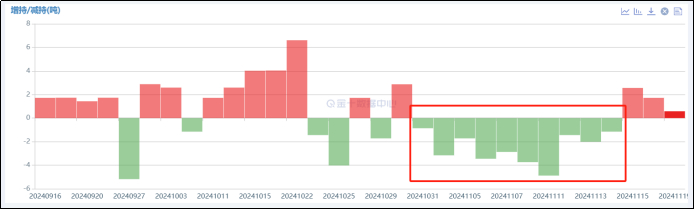 不过短期来看,黄金价格也的确存在回踩风险。一来是特朗普对黄金等关税预期被逐步弱化或落空,使得资金“卖现实”(一般资金买在预期,卖在落地);二来由于当前金价新高或高位,黄金多头投机资金有很大概率减持黄金来进行获利了结,比如(下图)去年10月底11月前半月那次新高后就出现了部分资金对黄金ETF的集中减持。