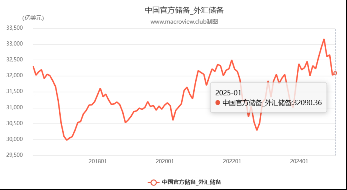 数据上更加直观,首先近些年我国外汇储备处于震荡上升,而且美元资产占比正在减少。一方面根据2024年11月的数据,我国持有的美国国债约为7685.99亿美元,占彼时外汇储备规模的四分之一(约24%);到2025年1月底,我国外汇储备规模为32090亿美元,其中美元资产的占比虽未在官方数据中直接披露,但基本可推测仍在25%左右这个大致范围。甚至可以推断全球的央行