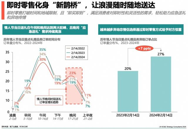在饿了么平台上,过去三年,情人节当日送礼订单都在午间(10-14点)和晚间(17-21点)达到两大驼峰,且晚间“应急送礼”需求不断高涨,从2022年的21%增长到2024年的23%。即时零售打破时间和地域限制,也真化身为“新鹊桥”,便利更多异地恋情侣及时给到浪漫惊喜。饿了么数据显示,过去2年,情人节当天礼赠品类中的异地订单占比,从2023年的20%增长到2024年的27%。