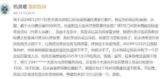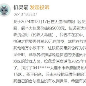在大连上学的荣同学投诉表示,2024年12月17日,他使用圆通从学校往家里寄快递,学校位于在大连市旅顺口区,所寄物品包括证书、日用品、被褥和衣服,共两个大包裹价值约5000元。快递到达大连市开发区收货点时,因自己不在家中,就让快递代收点代为保管。代收点工作人员称寄存需要30元存放费,荣同学同意后,代收点对包裹进行了签收。次日,工作人员联系荣同学表示,因快递数量太多空间有限,快递员先将他的包裹存放至仓库,并保证不会丢。