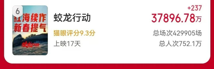 《红海行动》2018年上映后收获了36.52亿票房。截至2月14日15时许,《蛟龙行动》的票房超3.78亿,暂居档期第6。