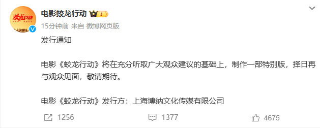 2月14日,电影《蛟龙行动》发文称,将在充分听取广大观众建议的基础上,制作一部特别版,择日再与观众见面,敬请期待。