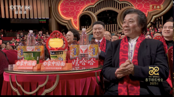 先是冠名了2024年底的“抖音美好惊喜夜”,随后在2025年的央视总台蛇年春晚,它也刷足“存在感”。镜头扫过观众席,它的产品出现在小圆桌——这是历年来春晚醒目的广告位。在小品《金龟婿》中,马丽用8盒白象香菜面鉴定未来女婿沈腾;小品《小明一家》里,出现了白象咔芝脆干脆面,成为推动剧情的重要道具。更不必说,白象的广告语还直接出现在了主持人的口播中。更早之前,它还和游戏《王者荣耀》跨界联名。