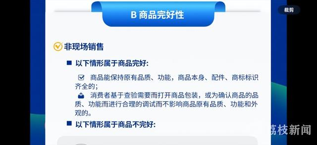 江苏苏博律师事务所律师吴国皓介绍:“规范当中指出商品本身配件、标识齐全的或者是消费者基于查验需要,打开商品包装或者为了确认商品的品质、功能,而进行合理的调试,不影响商品原有品质、功能和外观的,这种情况都属于商品完好。”