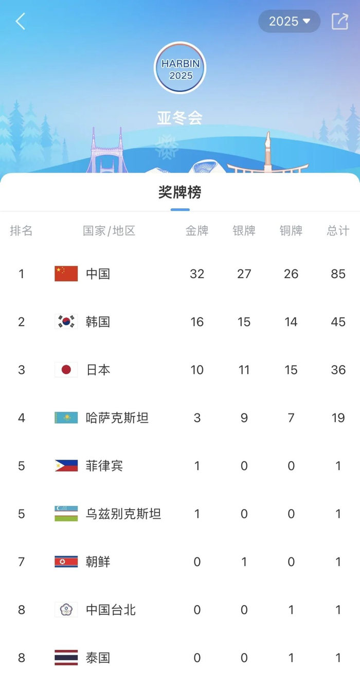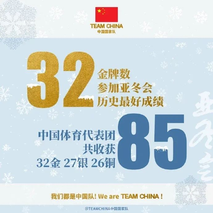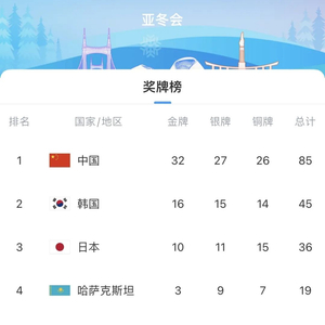 在哈尔滨亚冬会上,中国队共收获32金27银26铜,合计85枚奖牌。辛苦了,中国体育健儿!