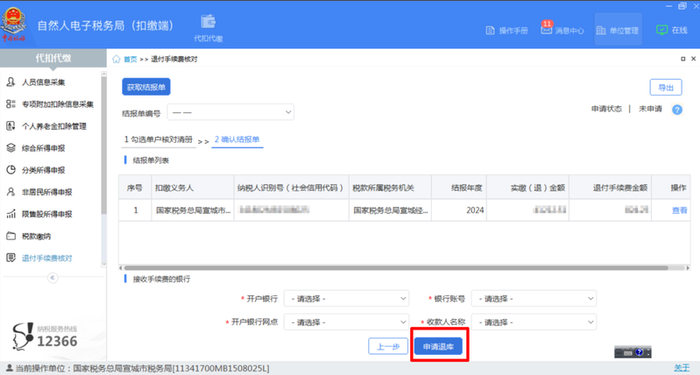 四.查看并确认结报单,查看申请退付手续费金额,选择“开户银行”“银行账号”等信息,点击【申请退库】。
