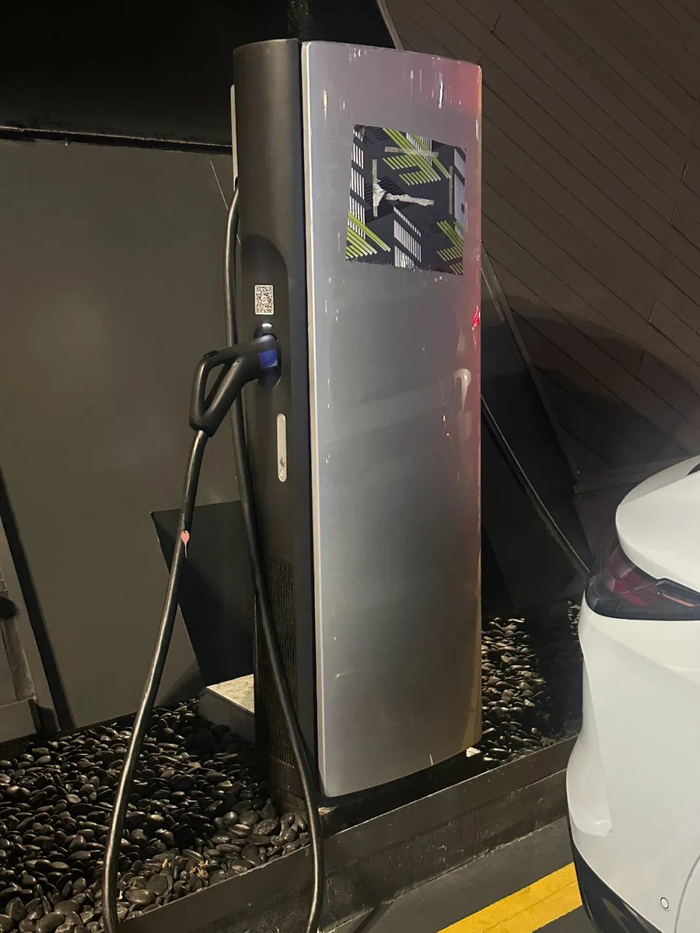 超充桩整体设计非常简约,方方正正的造型,正面灰色,侧面黑色。