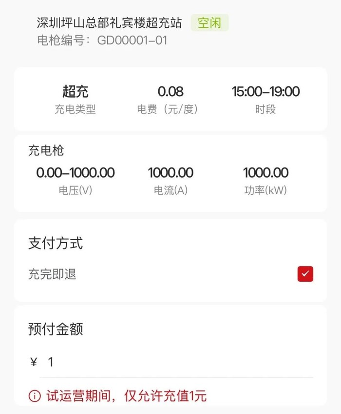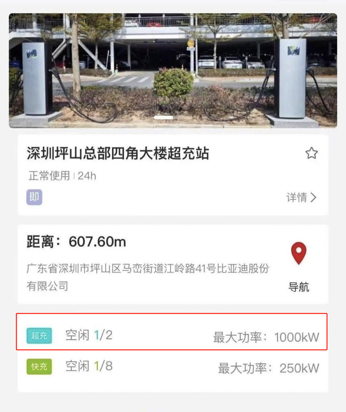 比亚迪总部,几个功率高达1000kW的超充桩,已经开启试运行,简单扫码便可充电,8分钱一度电。
