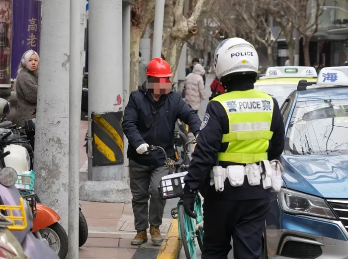 但核实身份信息时,杨君发现违法人员有摩托车驾照。“你明明考过驾照,怎么会不了解交通规则呢?就算不了解,我可以现在跟你普法。”杨君指着路口另一侧的非机动车禁行标志,“有这个标志的路段,就是禁止自行车、电动自行车这些非机动车通行的。上海有不少禁非路段,你回去也跟工友们宣传下。如果违法骑行,要罚款50元。”