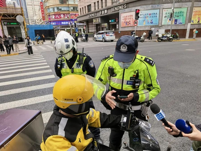 不到10分钟,杨君和同事就纠处了3起非机动车“闯禁”违法。因紧邻南京东路商圈,平日中午用餐高峰时段,外卖骑手在九江路“闯禁”、骑上人行道上等情况突出,交通违法较多。“希望能通过加强对违法者的教育和处罚,帮助骑手提升遵法守规的意识,营造更加安全有序的交通环境。”