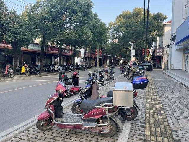 路边大量电瓶车承载商榻的镇村交通。