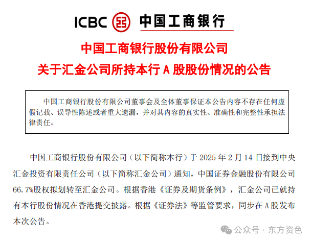 中国工商银行股份有限公司(以下简称本行)于2025年2月14日接到中央汇金投资有限责任公司(以下简称汇金公司)通知,中国证券金融股份有限公司66.7%股权拟划转至汇金公司。根据香港《证券及期货条例》,汇金公司已就持有本行股份情况在香港提交披露。根据《证券法》等监管要求,同步在A股发布本次公告。
