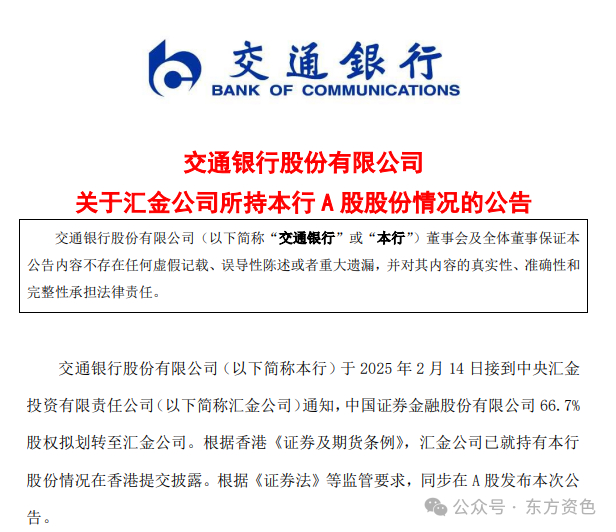 交通银行股份有限公司(以下简称本行)于2025年2月14日接到中央汇金投资有限责任公司(以下简称汇金公司)通知,中国证券金融股份有限公司66.7%股权拟划转至汇金公司。根据香港《证券及期货条例》,汇金公司已就持有本行股份情况在香港提交披露。根据《证券法》等监管要求,同步在A股发布本次公告。