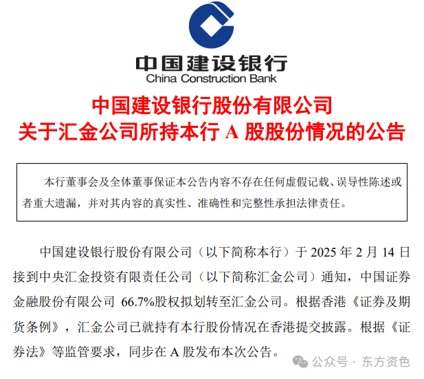 中国建设银行股份有限公司(以下简称本行)于2025年2月14日接到中央汇金投资有限责任公司(以下简称汇金公司)通知,中国证券金融股份有限公司66.7%股权拟划转至汇金公司。根据香港《证券及期货条例》,汇金公司已就持有本行股份情况在香港提交披露。根据《证券法》等监管要求,同步在A股发布本次公告。