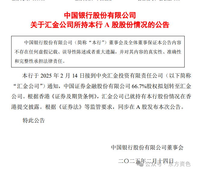 中国银行股份有限公司于2025年2月14日接到中央汇金投资有限责任公司(以下简称“汇金公司”)通知,中国证券金融股份有限公司66.7%股权拟划转至汇金公司。根据香港《证券及期货条例》,汇金公司已就持有本行股份情况在香港提交披露。根据《证券法》等监管要求,同步在A股发布本次公告。