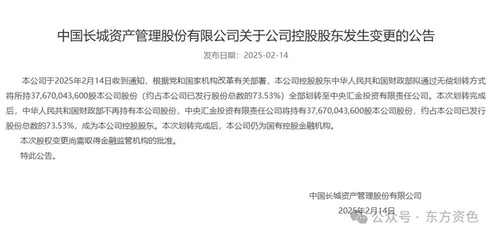 中国东方资产管理公告称,本公司于2025年2月14日收到通知,根据党和国家机构改革有关部署,本公司控股股东中华人民共和国财政部拟通过无偿划转方式将所持48,829,977,540股本公司股份(约占本公司已发行股份总数的71.55%)全部划转至中央汇金投资有限责任公司。