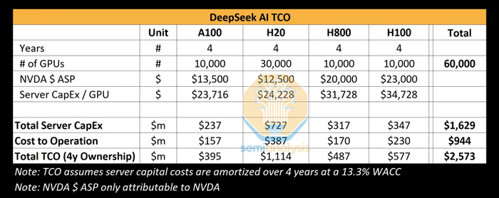Semianalysis(一家专注半导体和人工智能的独立研究与分析公司)也给出了DeepSeek的AI TCO(人工智能领域中的总成本)分析,这张表总结了DeepSeek AI在使用四种不同型号GPU(A100、H20、H800和H100)时的总成本情况,包括买设备、建服务器和运营的费用。按照四年周期来算,这60,000块GPU的总花费是25.73亿美元,其中主要是买服务器的费用(16.29亿美元)和运营的费用(9.44亿美元)。