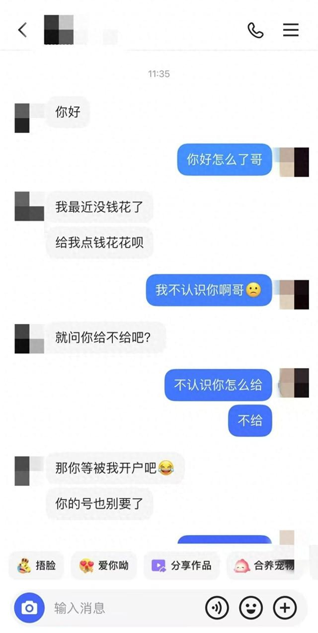 2024年12月14日,魏高收到一名陌生用户的私信,对方说自己“最近没钱花了”,要求他“给点钱花花”。被拒绝后,他“警告”魏高说:“你等着被我开户吧,你的号也别要了。”魏高问原因,对方回复:“因为你不给我钱花。”