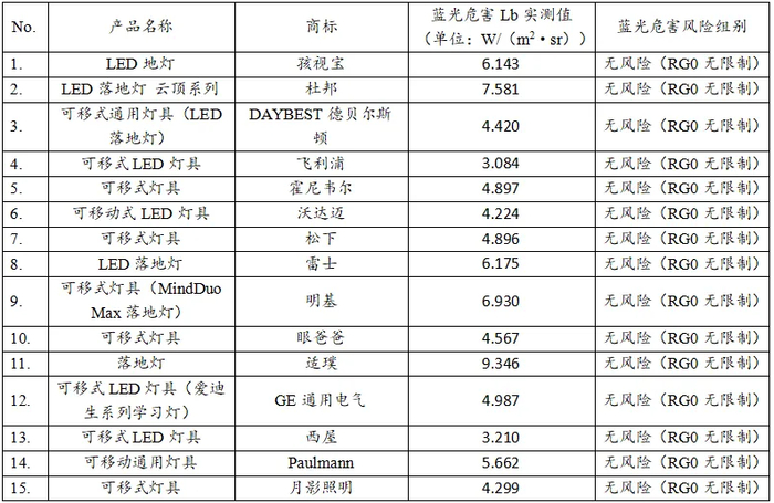 结果显示,15批次样品的蓝光危害风险组别均为GB/Z 39942-2021划定的无风险(RG0无限制)。