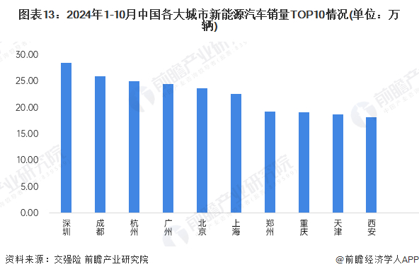 从全国各大城市新能源汽车的销量情况来看,2024年1-10月,深圳以28.53万辆位居第一,其次是成都、杭州等,销量均在25万辆以上,其次是杭州、广州、北京、上海、郑州等等。总体来看,我国经济发达地区新能源汽车销量居前,西北地区销量相对冷淡,这些地区的新能源汽车渗透率仍有较大的提升空间。