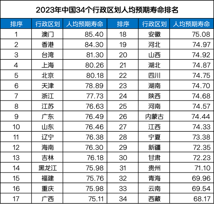 国内各地区人均预期寿命的趋势也大体相似,今天的长寿之乡早已变成了港澳北上广深杭等大城市。