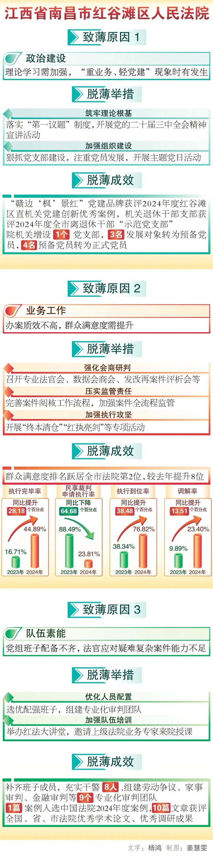“红谷滩区法院担当实干,攻坚克难,以强烈的责任感和使命感狠抓各项工作,审判质效有了大幅提升,党建工作、队伍建设等得到全面加强,脱薄工作迈出新步伐。”全国人大代表、江西省律师协会副会长冯帆到江西省南昌市红谷滩区人民法院调研时,对该院脱薄工作评价道。