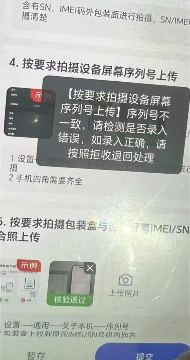 • 记得把盒子+手机一起拍,快递员拍照时,一定要同时拍摄盒子SN码和手机屏幕上的SN码,这一步很关键!