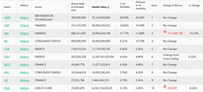 整体而言,伯克希尔的前十大持仓标的的排名未出现顺序变化,分别依然是苹果、美国运通、美国银行、可口可乐、雪佛龙、西方石油、穆迪、卡夫亨氏、丘博保险和德维特。这十大持仓股占伯克希尔持仓总市值的89.72%。
